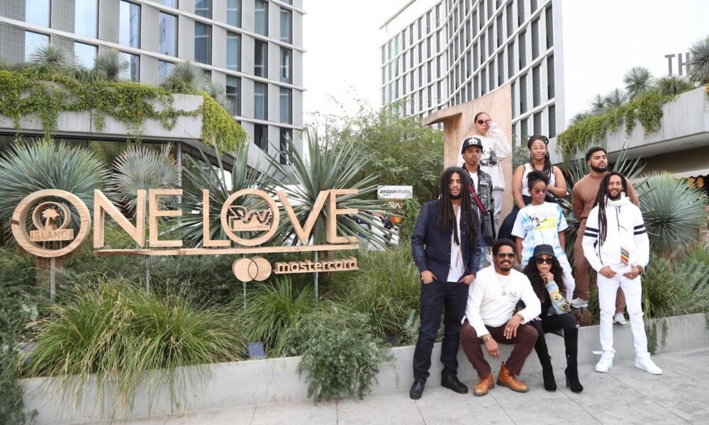 WEST HOLLYWOOD, CALIFORNIA – JANUARY 24: Skip, Joshua, Mystic, Zuri, Nico, Rohan, Cedella, Shacia and Julian Marley pose outside Primary Wave x Island Records Presented By Mastercard: One Love Hotel – Marley Brunch at 1 Hotel West Hollywood on January 24, 2020 in West Hollywood, California. (Photo by Jerritt Clark/Getty Images for Island Records)