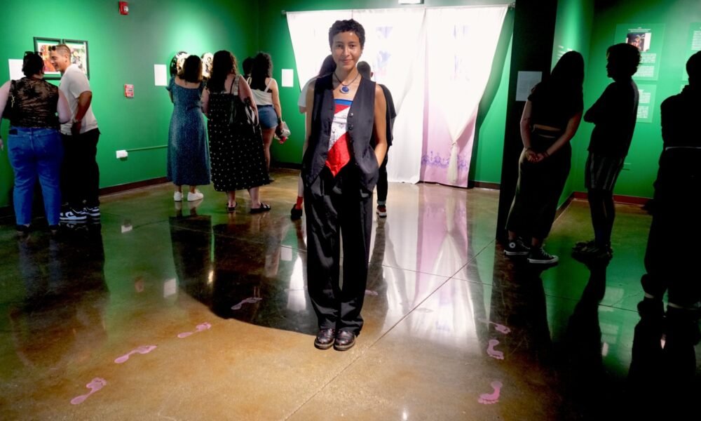 One of the larger paintings on display is by Isabella Mellado, who lives in West Town and recently moved to Chicago from Puerto Rico. Being able to showcase her work — which highlights both of her identities — for the first time is a prideful, emotional experience, she said.