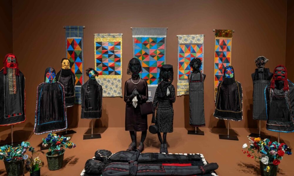 By the early 1970’s, Ringgold’s emerging feminist consciousness and growing interest in non-western art would inspire her first foray into textiles. The Wake and Resurrection of the Bicentennial Negro was Ringgold’s first masked performance work. It was conceived in response to the American Bicentennial celebrations of 1976. Bridging craft techniques with diverse ceremonial traditions, the installation demonstrates Ringgold’s pursuit in finding forms more suitable for the radical exploration of gender and racial identity themes central to her work.