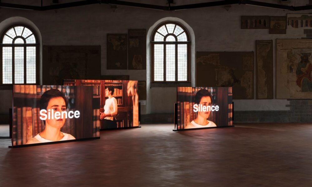 Here, as in other works, Boyce often creates a polyphonic space that fosters relationships based on improvisation, building with sound a community by training the coexistence of different voices: the final work on view was generated by the artist’s meditative mixing of video and photographic material filmed during the sound improvisation of the singers in the library spaces and a spontaneous performance in Piazza Vecchia when people started to sing from balconies— a collective performance that holds some explicit reference to the harsh lockdown period in the city (the most severely affected province in the world).
