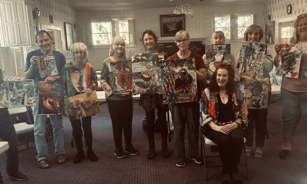 Fallbrook Artists Association artist Karen Langer Baker, at front, who demonstrated collage artwork techniques at the May meeting of the Fallbrook Women’s Club, poses with nine of the 10 participants and their completed pieces, some of which were created on thrift store-purchased paintings on canvases.