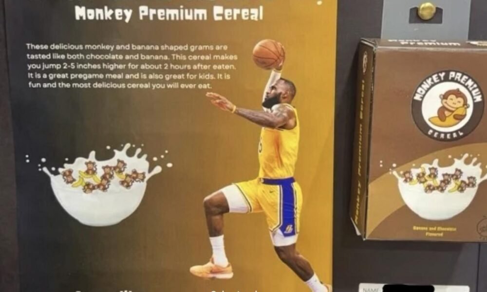“Eat Monkeys Jump Like Monkeys! Monkeys Premium Cereal” along side a bowl of “monkey icon” cereal and NBA legend Lebron James. This piece of artwork was hanging at the community art show at New Hartford High School on Saturday, and somehow it made it through layers of filters in the art department.