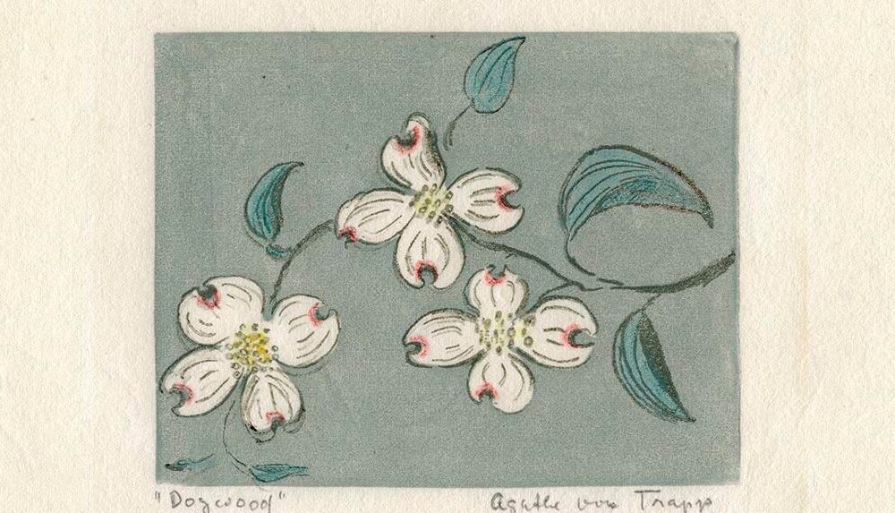Helene and Johanna had considerable success selling the lovely European-style watercolors early in their collaboration. At a 1984 One Woman Show & Art Auction to benefit Seattle Opera and Civic Light Opera, they sold 90 originals. That prompted another event in Portland with similar results. That’s when both Maria and Agathe signed with Helene to sell their own artwork. While Johanna’s work usually included images of nature, especially edelweiss, forever endured to audiences through the song written specifically for “The Sound of Music,” Agathe’s work included crayon etchings, which she made into linoleum block prints that were used in illustrations and greeting cards. Some of the schoolteacher’s most popular work was linoleum block prints of the Stations of the Cross that the young woman made between concerts when the family was on a bus tour of the U.S. and many of her pieces are religious in nature. Maria, who also began painting later in life, served as a missionary in Papau, New Guinea, and while there she developed a style of fingerpainting abstract “fantasies.”
