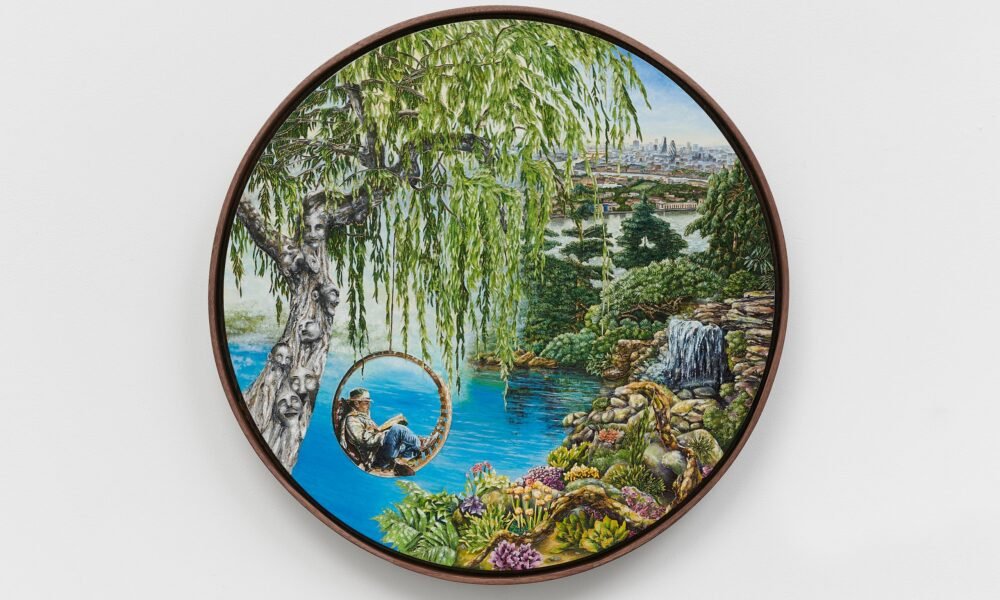 Raqib Shaw has created a similarly wild refuge for himself in the middle of Peckham. Situated next to South London Gallery’s Fire Station building in a former sausage factory, Shaw’s complex features a paradisal rock garden that belies its city location. Many aspects of the garden appear in his intricate paintings, from the wooden swing that features in Summer Solitude I (2021) to the worn stones in La Tempesta (after Giorgione)(2019). While his paintings often appear to have come from the depths of his imagination, they in fact draw on references to art history and to his own luscious home.