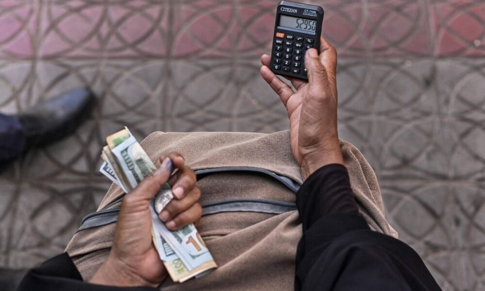 Noura Hassan, uses a pocket calculator to convert the worth of US dollars offered by a client into … [+] Djiboutian francs at a...