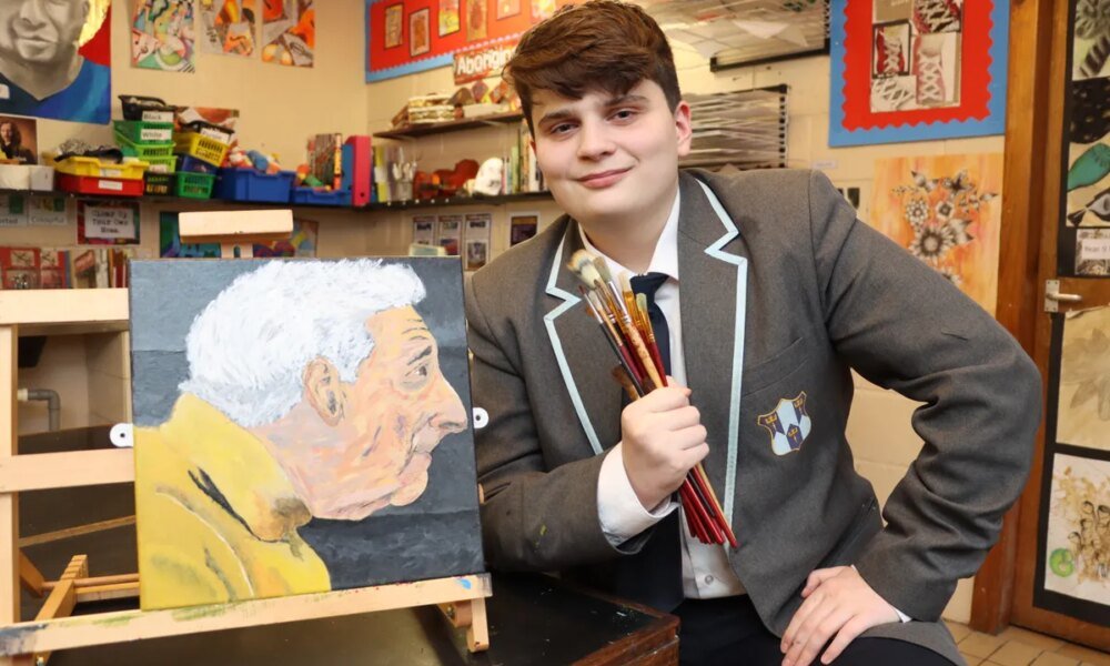 James Doyle, 14, triumphed in the 11 to 14 years category with a striking acrylic portrait on canvas titled “Nosey Man”,...