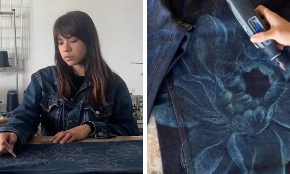Deftly wielding a rotary tool as seemingly fluidly as a brush, Starobrat sands down dark jeans to reveal innovative patterns that are highly personal for the young artist. “I take a lot of inspiration from my childhood,” Starobrat tells My Modern Met. “My grandma was very present growing up so a lot of the inspiration stems from things that remind me of her, things I’d find in her house, and things she’d carry around, such as tigers, florals, and embroidery patterns.”
