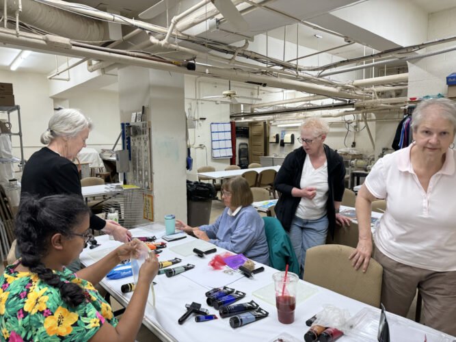 Printmaker Frances Metcalf, right, was able to impart her gel printmaking skills to attendees of her Stifel Fine Arts Center classes. (Photo Provided)