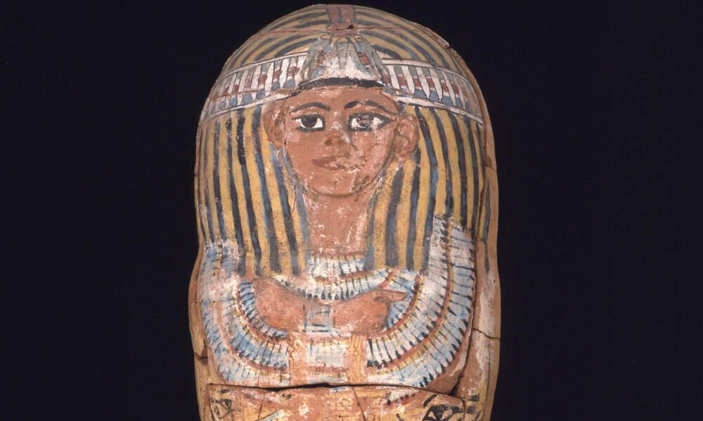 The clay coffin features the image of a boy named Paneferneb. A blue and yellow striped headdress adorns his face, which is painted red, like his crossed hands. Eyes, lotus flowers, jackals, the winged goddess Nut, the god Osiris and hieroglyphics adorn the coffin’s exterior. The object dates to 1295-1186 B.C.