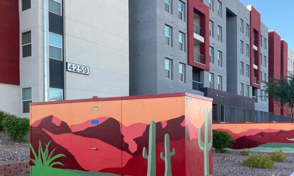 Colorful desert-themed artwork now graces three Las Vegas Valley Water District (LVVWD)-owned utility boxes near The Degree student housing, adding a vibrant and charming aesthetic to one of the busiest parts of campus. The designs were created by some of UNLV’s brightest artists as part of the Art in Public Places course.