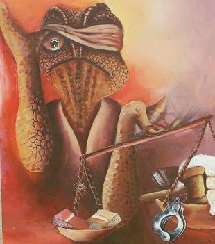 The Chameleon as a dominant subject in Parmu Christine’s paintings is a representation of the routine camouflaging nature of the Ugandan political bourgeoisie who often use their positions to steal and oppress the citizens. In one painting, Greed, the artist allegorically depicts a chameleon grasping a full bowl of insects but still seeking to feed onto other insects that lie in its midst. “In this painting, you can see that the Chameleon already has enough to eat but is still yearning for more out there. This behaviour is typical of our leaders who already have enough but still want to acquire more,” she says. In another painting, Lady Justice, inspired by Lady Justice, a symbol of unbiased justice, the artist portrays the Chameleon with an image of a judge dressed in judicial robes. The artist dramatically illustrates the lack of fairness in the services of the magistrate by manipulating this particular symbol of equal justice in the painting. Instead of presenting a female figure blindfolded- as should be expected- she paints a half blindfolded female figure to suggest a flawed judicial system.