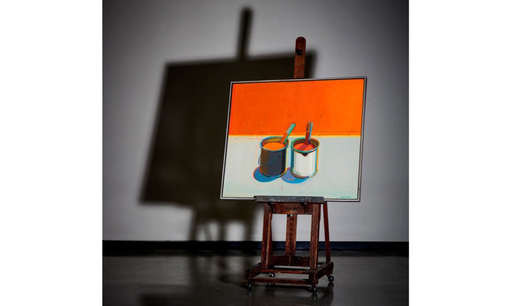 The star of the show is a new-to-market work by Raimonds Staprans (b. 1926) titled, “Blue Skies, Red Paint,” 1994. Moran’s is excited to, once again, offer Staprans’s work since they achieved the world auction record for the artist last August with his orange-themed painting, “A Study of Down Rolling Oranges with a Staid Neon Apple,” 1995, achieving $237,500 (including buyer’s premium). Lot 34, “Blue Skies, Red Paint,” 1994, estimated $100,000-200,000, and was exhibited in, “Raimonds Staprans,” at the Mendenhall Gallery in Pasadena, CA from January 13-February 8, 1996, with Staprans’ current record holder set by Moran’s last summer. Also presented in this sale, Staprans’s “A Can and Orange,” 1996, estimated $20,000-40,000, and purchased from the Mendenhall Gallery during their 1997 exhibit, “Raimonds Staprans“.